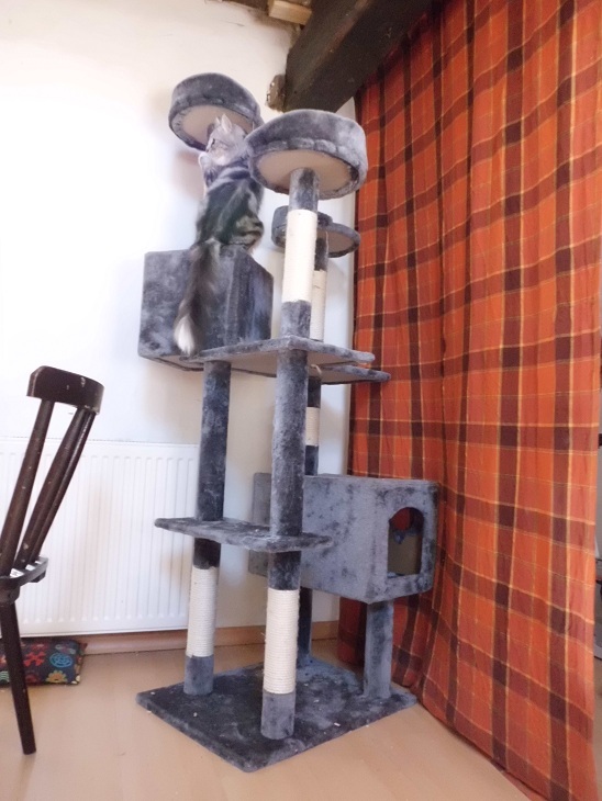 Kayla inspiziert den Kratzbaum - auch gerne als bequemer Aufstieg auf die Balken genutzt.