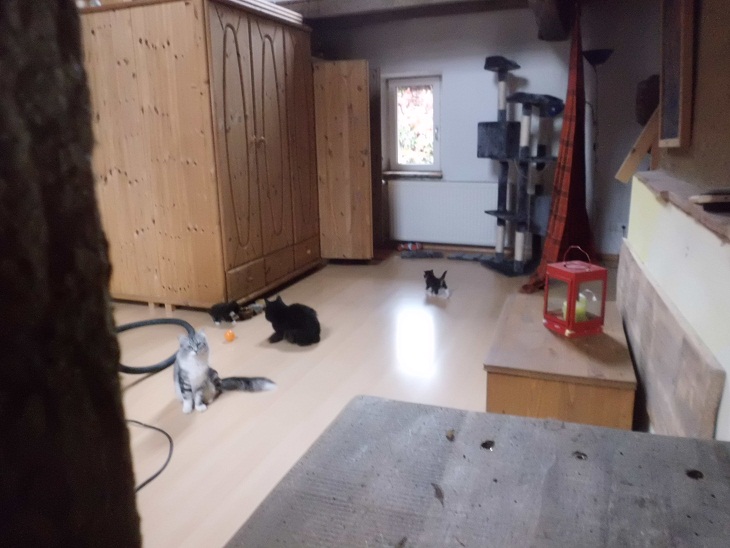 Fröhliches Treiben im Wohnzimmer. Die Fotografin hat sich sicherheitshalber im Flur hinter dem Katzeneingang verschanzt..